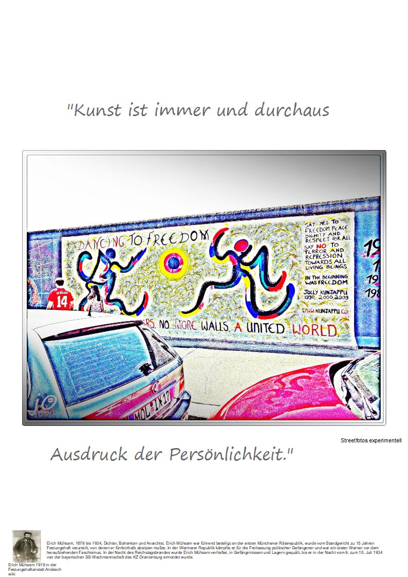 Erich Mühsam, 1878 bis 1934, Dichter, Bohemian und Anarchist. Erich Mühsam war führend beteiligt an der ersten Münchener Räterepublik, wurde vom Standgericht zu 15 Jahren Festungshaft verurteilt, von denen er fünfeinhalb absitzen mußte. In der Weimarer Republik kämpfte er für die Freilassung politischer Gefangener und war ein steter Warner vor dem heraufziehenden Faschismus. In der Nacht des Reichstagsbrandes wurde Erich Mühsam verhaftet, in Gefängninissen und Lagern gequält, bis er in der Nacht vom 9. zum 10. Juli 1934 von der bayerischen SS-Wachmannschaft des KZ Oranienburg ermordet wurde.