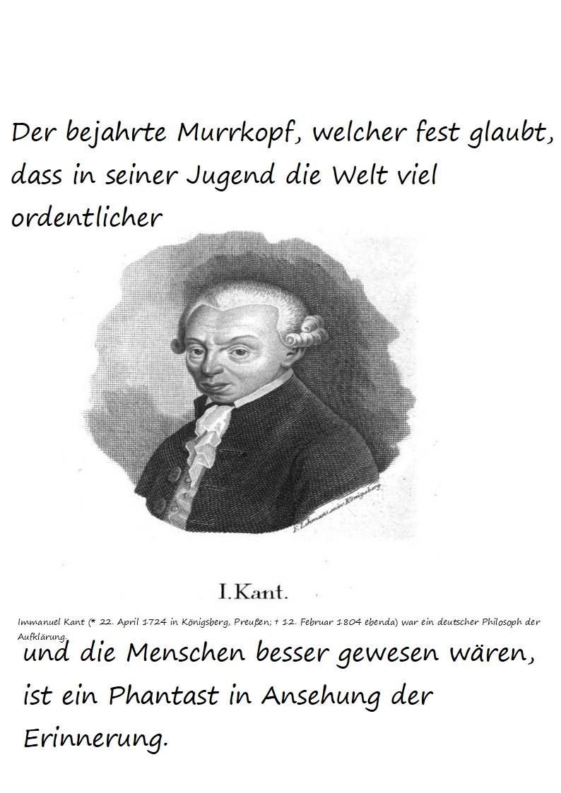 Der bejahrte Murrkopf, welcher fest glaubt, dass in seiner Jugend die Welt viel ordentlicher und die Menschen besser gewesen wären, ist ein Phantast in Ansehung der Erinnerung.